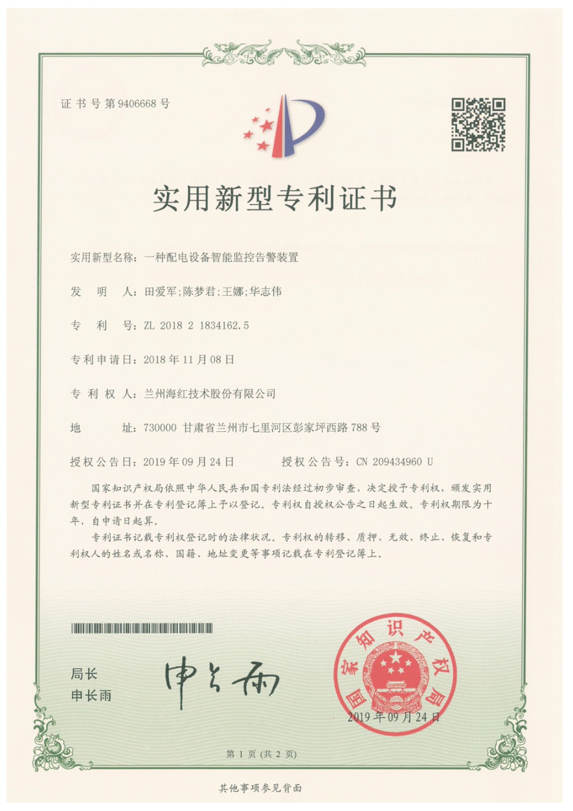 我公司再次取得一項(xiàng)實(shí)用新型專利,至此我公司申請(qǐng)受理專利與軟件著作權(quán)登記累積103項(xiàng),已獲得授權(quán)79項(xiàng)(其中發(fā)明專利10項(xiàng),實(shí)用新型專利57項(xiàng),軟件著作權(quán)9項(xiàng),外觀設(shè)計(jì)專利3項(xiàng))。
