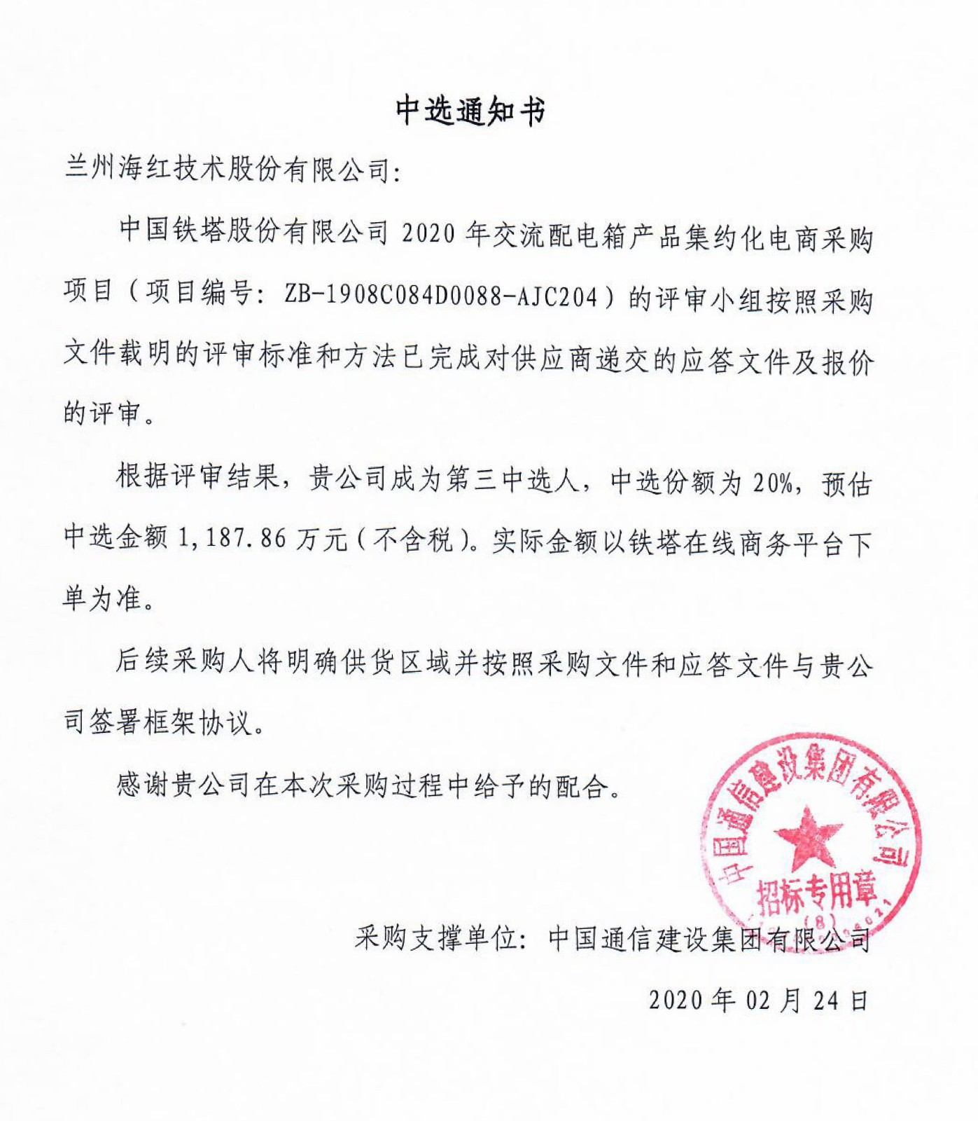 我司成功中選“中國(guó)鐵塔2020年交流配電箱產(chǎn)品集約化電商采購(gòu)”項(xiàng)目,中選份額為20%,預(yù)計(jì)中選產(chǎn)品數(shù)量9000余臺(tái),預(yù)估中選金額1,187.86萬(wàn)元(不含稅),將對(duì)我司經(jīng)營(yíng)業(yè)績(jī)、市...