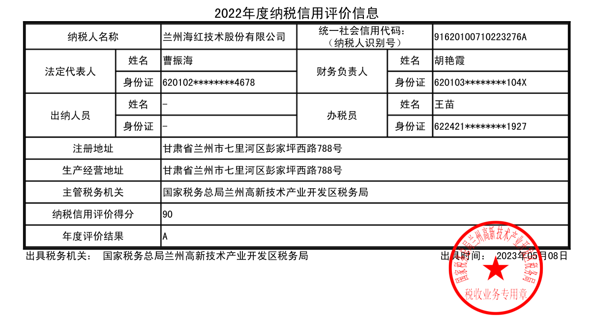 我司被國(guó)家稅務(wù)總局甘肅省稅務(wù)局評(píng)價(jià)為“2022年度納稅信用A級(jí)納稅人”。至此,我司已連續(xù)九年被評(píng)價(jià)為“納稅信用A級(jí)納稅人”,這是稅務(wù)機(jī)關(guān)對(duì)公司堅(jiān)持誠(chéng)信經(jīng)營(yíng)、依法納稅的充分肯定,有助于公司在銀行信貸、經(jīng)營(yíng)投標(biāo)等方面維護(hù)良好的信譽(yù)和形象,有利于促進(jìn)公司可持續(xù)發(fā)展。